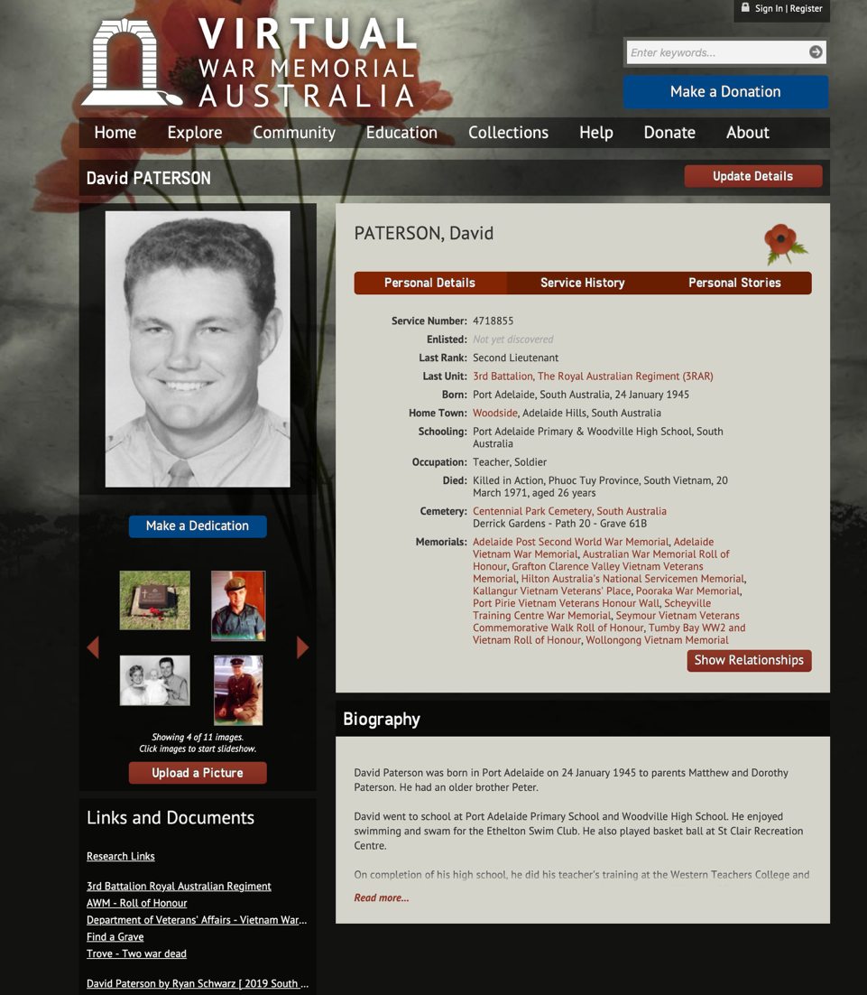 David Paterson was born in Port Adelaide on the 24th of January 1945 to Mathew and Dorothy Paterson. He had an older brother, Peter. David went to school at Port Adelaide Primary school and then to Woodville High School. He enjoyed swimming, being a member of the Ethelton Swim Club; and basketball, playing at the St Claire recreational centre. After graduating from school, David immediately began teacher training at the Western Teachers’ College. A few days before his 20th birthday, he graduated from college and was accepted into a one-teacher school in Mount Hill on the 11th January 1965. Whilst there he continued swimming and basketball and also took up football for his local football club. The posting at Mount Hill lasted for two years. During this time he began travelling to Cleve and continued studying. It was because of this study that he had his National Service postponed twice. He loved his teaching and the students adored him. A fellow veteran after returning from Vietnam went back to Mount Hill to interview David’s students and found, “David is remembered with great fondness who enriched and valued their communities…It was very clear to me that David had left a lasting impression on these students”. In 1966, David met his future wife Christine at the Ethelton swimming club.